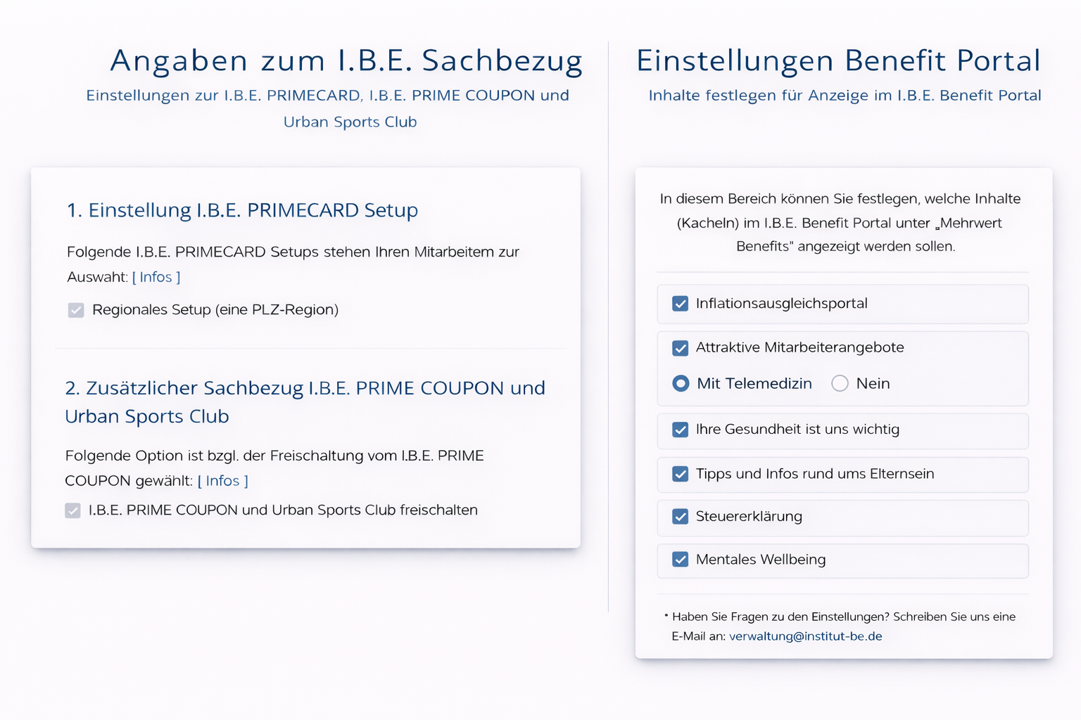 Das technologische Prinzip ist einfach: Arbeitgeber stellen das Budget bereit. Mitarbeiter entscheiden selbst. Jede Sachbezugslösung - I.B.E. PRIMECARD, I.B.E. PRIME COUPON und Urban Sports Club - wird individuell pro Mitarbeiter gesteuert und kann monatlich gewechselt werden. Ein vorhandenes Guthaben bleibt dabei vollständig erhalten.